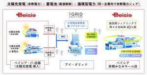 株式会社ベイシア(本部:群馬県前橋市、代表取締役社長:相木 孝仁)は、株式会社アイ・グリッド・ソリューションズ(本社:東京都港区、代表取締役社長:秋田 智一、以下「アイ・グリッド」)と連携し、グループ店舗における再生可能エネルギーの活用をさらに推進するため、11月18日(火)よりベイシア前橋みなみモール店に太陽光発電設備と蓄電池を新たに導入し、他店舗で生み出された余剰電力を融通する仕組みを構築したことをお知らせいたします。
